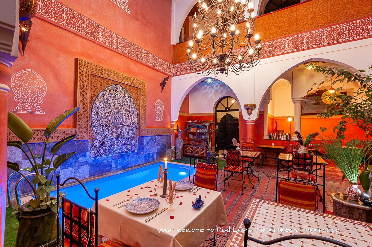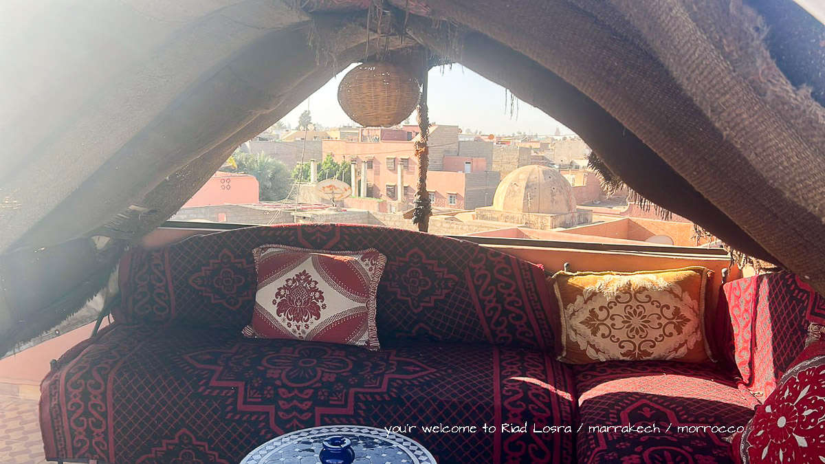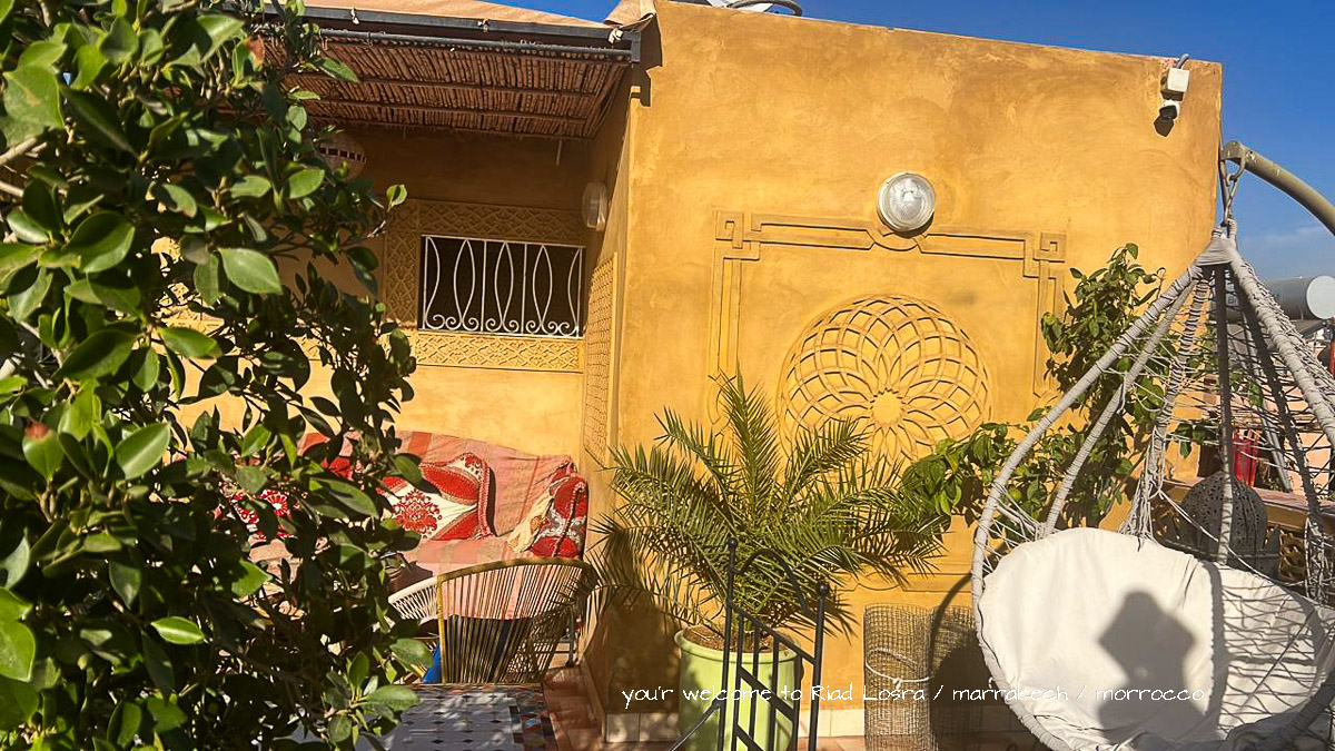 Die Räumlichkeiten des Riad Losra sind um einen überdachten hellen Innenhof „Bhou“ angeordnet. Man blickt auf Orangenbäume und einen Mauresken-Brunnen. Vom Riad-Eingang führt Sie eine Treppe in den ersten Stock, wo die Zimmer über eine dreiseitige Galerie zum Innenhof erschlossen werden. Auf der Dachterrasse im 2. Stock können Sie nach Lust und Laune entspannen. Von der Terrasse bietet sich ein wunderschöner Blick über die Medina, zum Atlasgebirge und zum nahen Palmenhain. Den Untergang der marokkanischen Sonne können Sie von hier oben oder von einer höher gelegenen Aussichtsterrasse verfolgen.